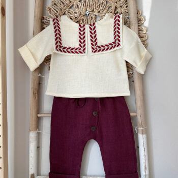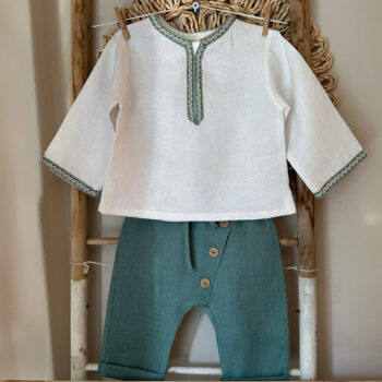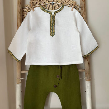 Costumas de botez cu guler din in organic Cream/ Moss Green