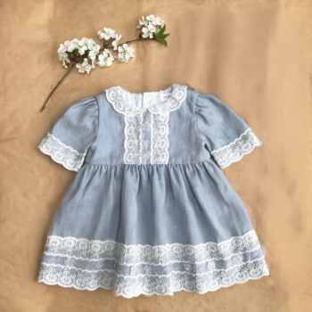 Rochita de botez din in organic Blue Grey Sky cu dantela cream
