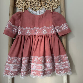 Rochita de botez din in organic Blush Salmon cu dantela alba