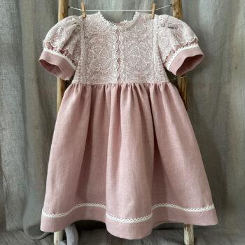 Rochie din in organic cu maneca scurta Dusty Pink cu dantela