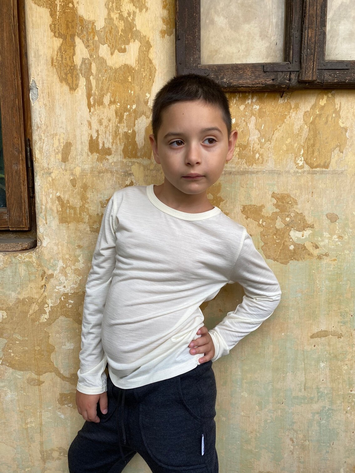 Bluza din  lână merinos si matase pentru copii. Subtire si aerat, perfect pentru a fi purtat in orice anotimp. Ideal ca strat de corp sau ca atare, datorita proprietatii lanii de a regla temperatura corpului.