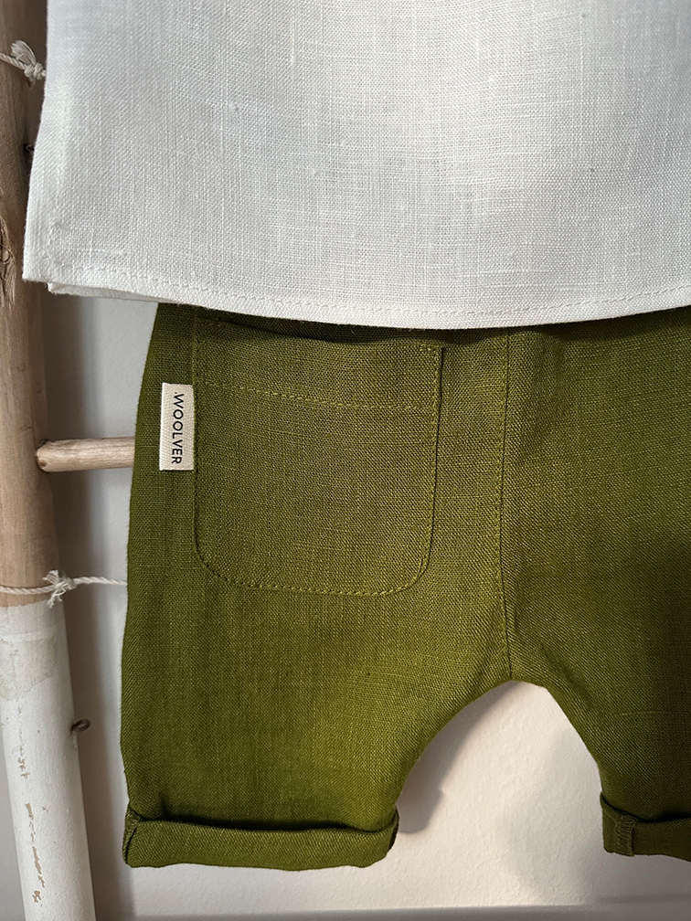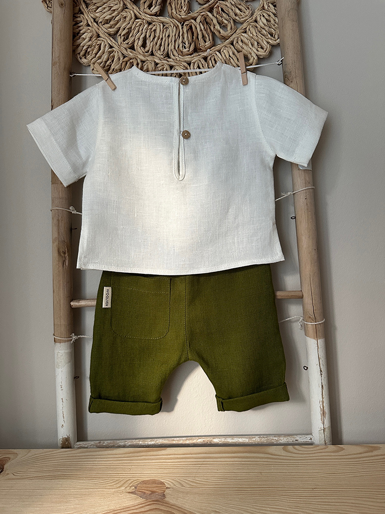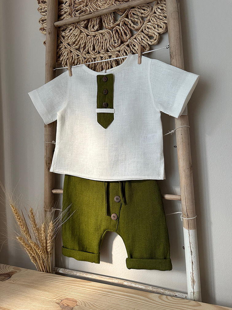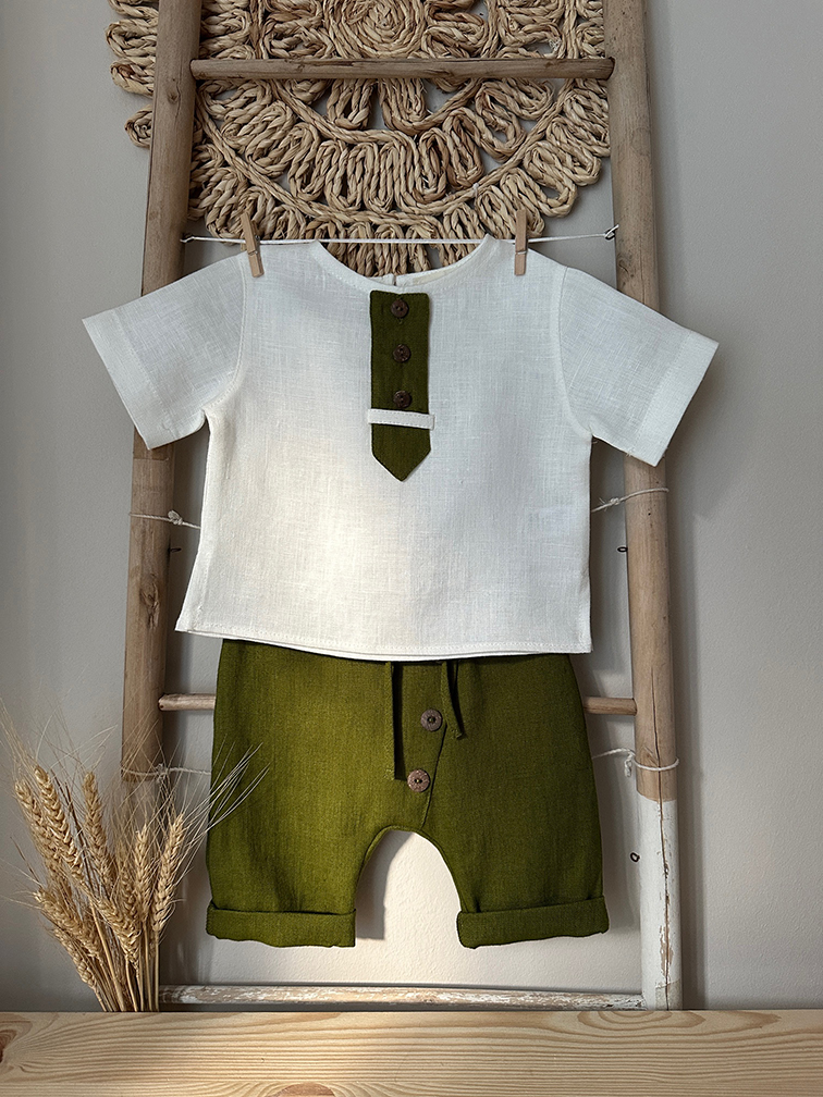 Costumas de botez cu maneca scurta din in organic. Ideal pentru ziua cea mare a micutului tau, dar comfortabil, usor de asortat si practic si cu alte ocazii. Setul cuprinde: