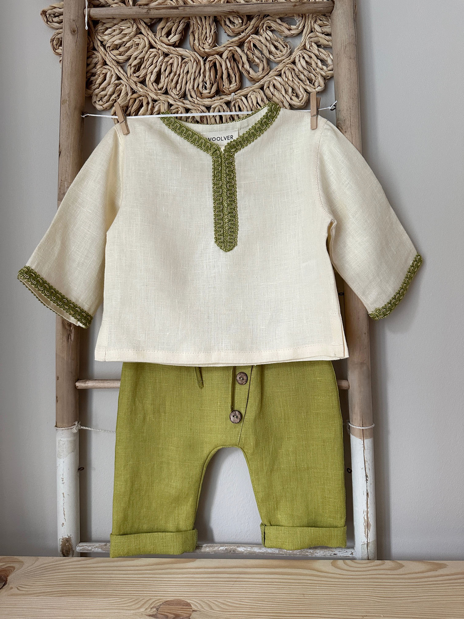 Costumas de botez din in organic. Ideal pentru ziua cea mare a micutului tau, dar comfortabil, usor de asortat si practic si cu alte ocazii. Setul cuprinde bluza si pantaloni din in.