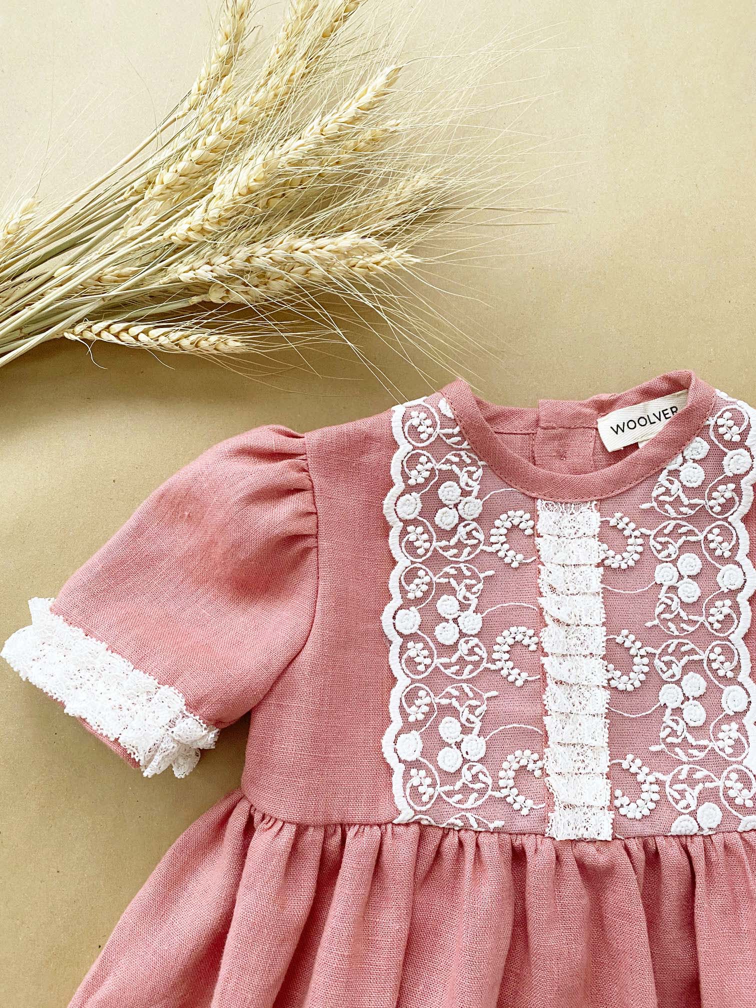 Rochie stil rustic cu dantela din in organic pentru copii. Practica si extrem de confortabila, dintr-un material delicat cu pielea celor mici.