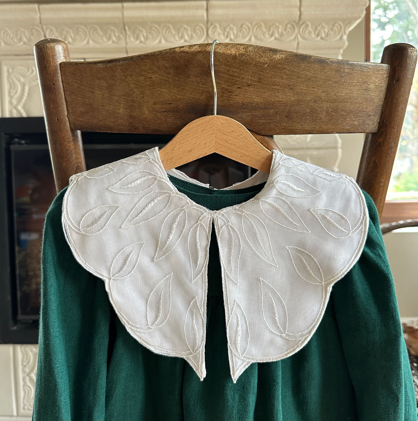 - Guler amplu, detașabil, realizat din in, dantela fina aplicata , care adaugă un aer festiv și sofisticat rochiei. Poate fi purtat atașat pentru un look elegant sau îndepărtat pentru un stil mai simplu și natural.