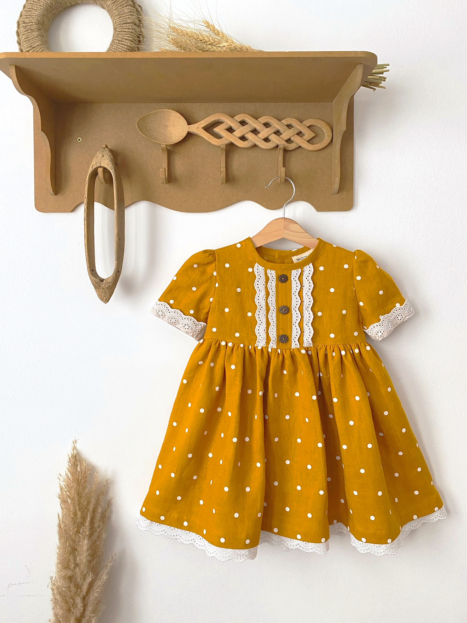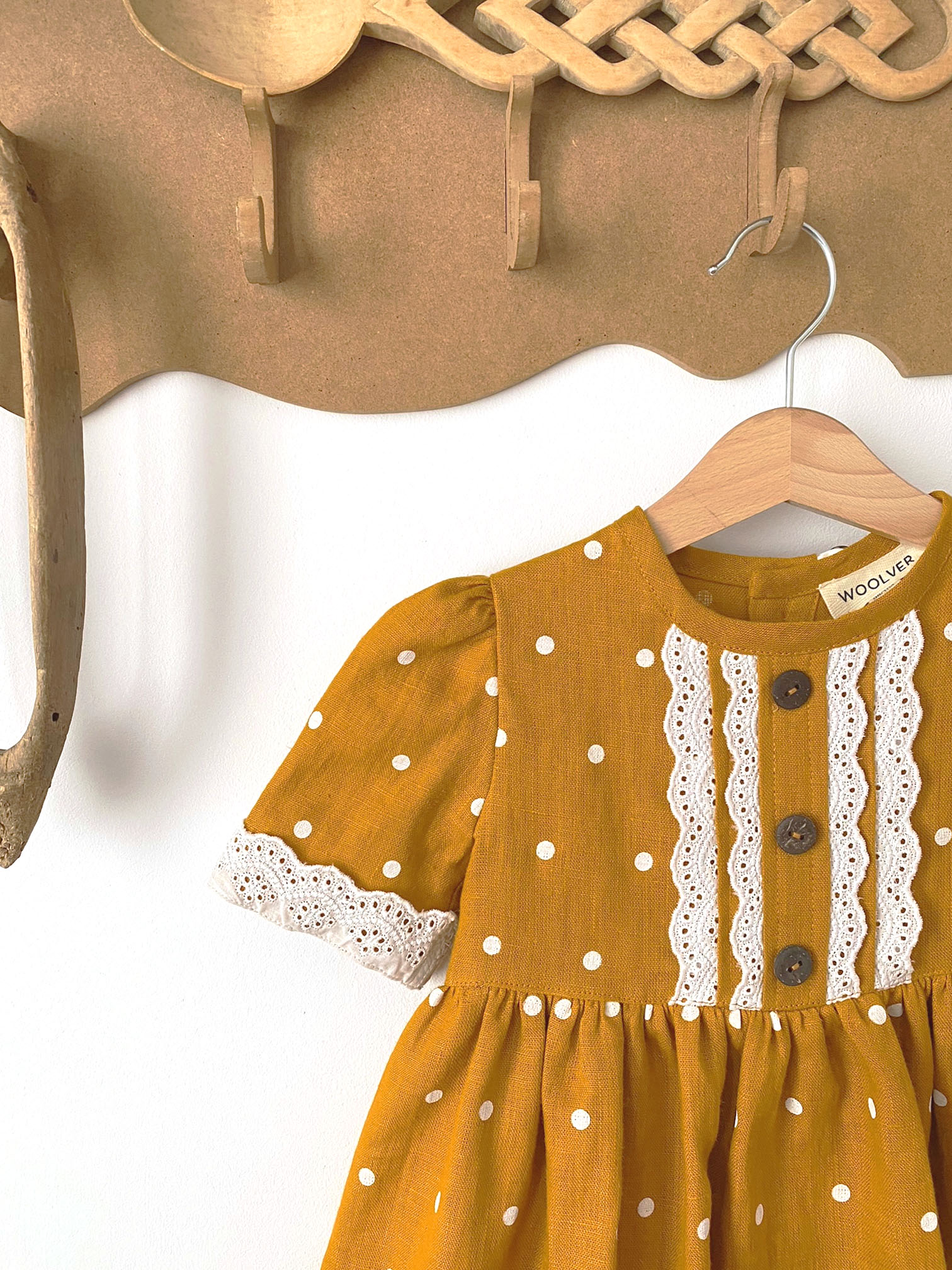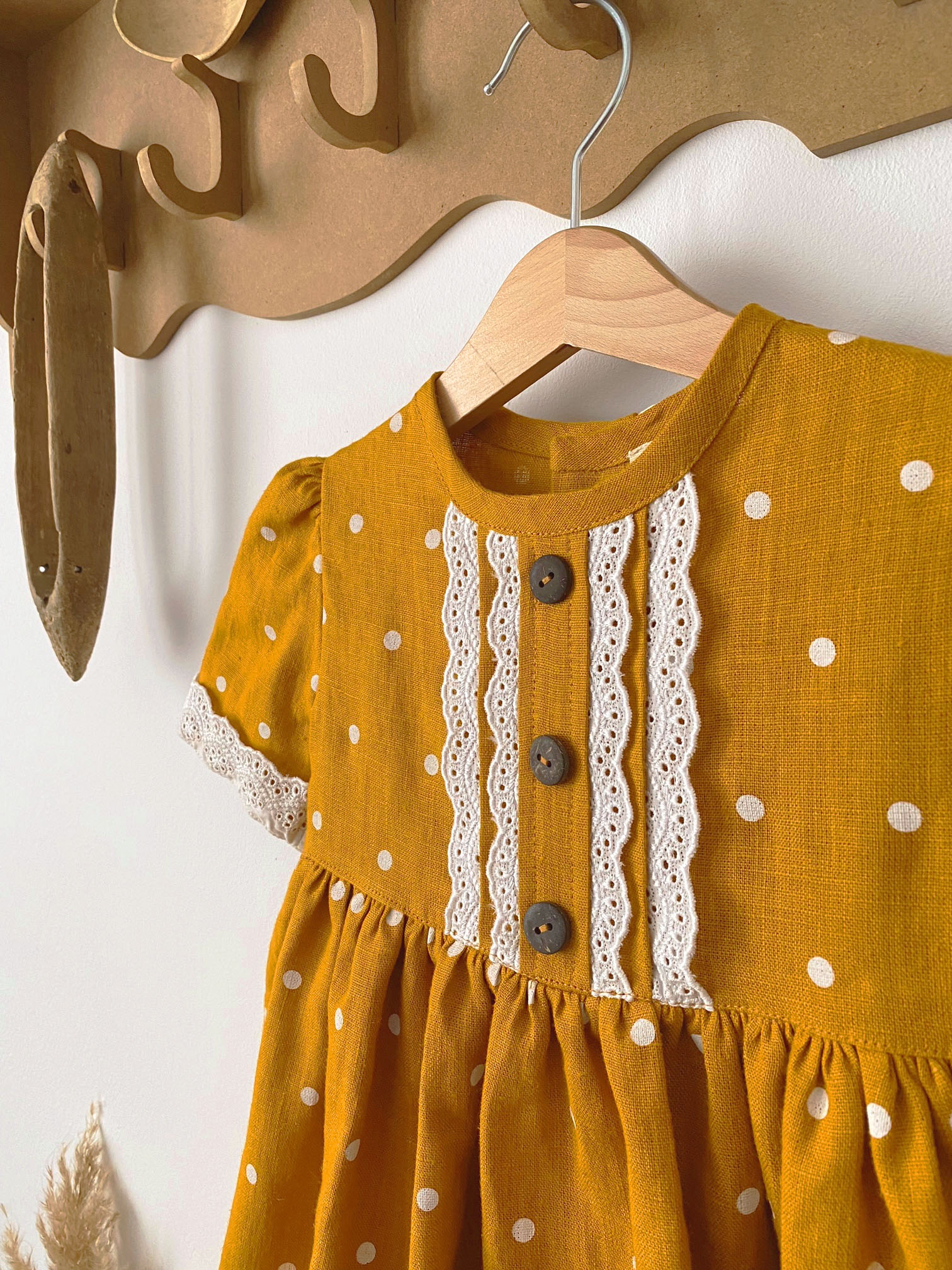 Rochie stil rustic cu model din in organic pentru copii. Practica si extrem de confortabila, dintr-un material delicat cu pielea celor mici.