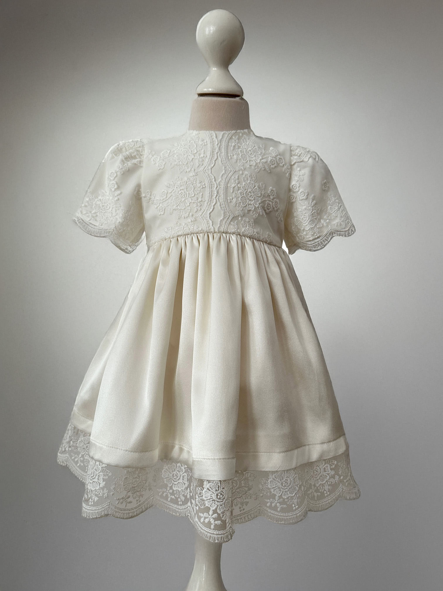 Rochita de botez din matase naturala si dantela. Ideala pentru ziua cea mare a micutei tale, dar confortabila, usor de asortat si practica si cu alte ocazii.