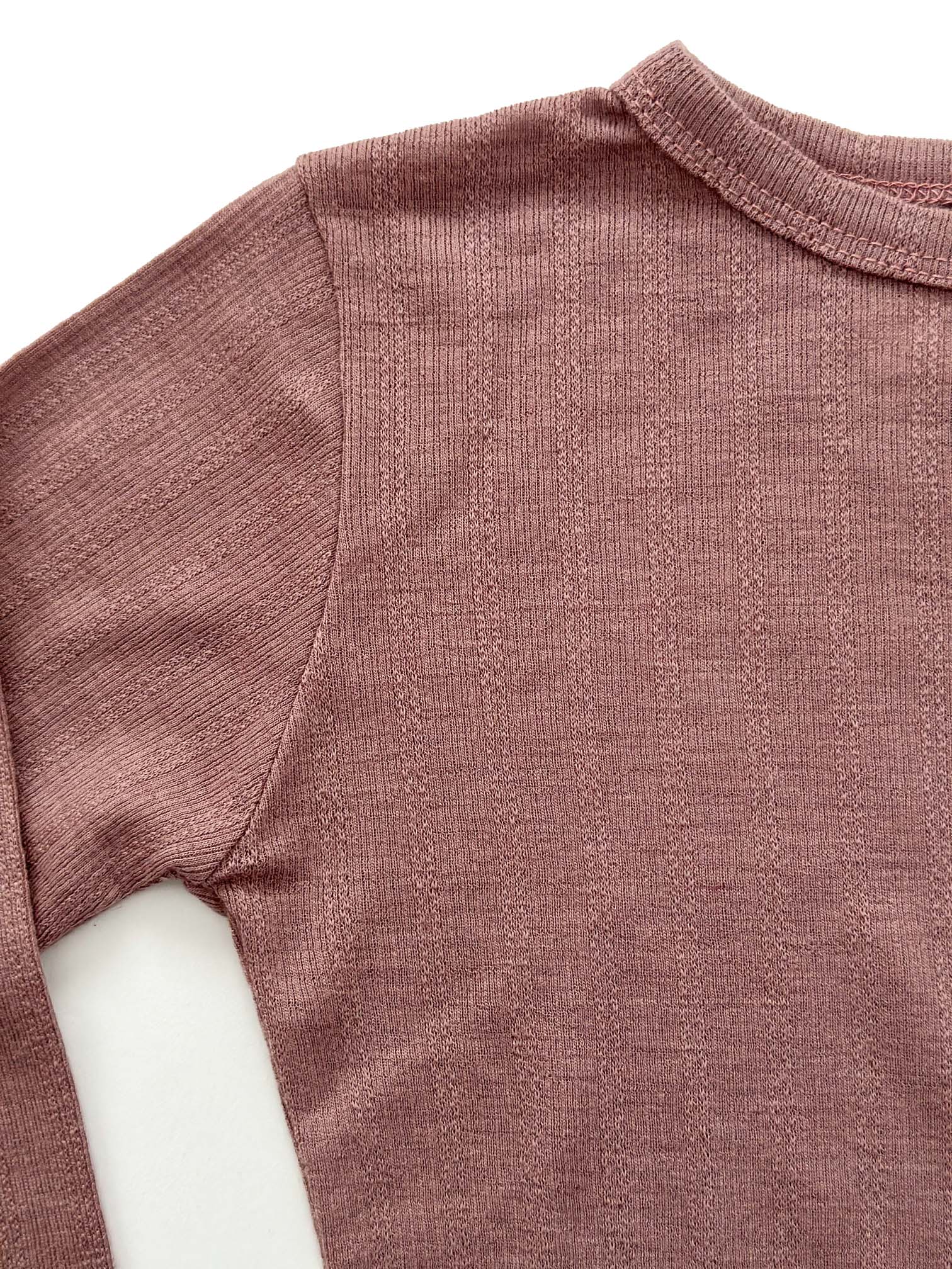 Set bluza si colanti din lână merinos rib pointelle . Subtire si aerat, perfect pentru a fi purtat in orice anotimp. Ideala ca strat de corp sau ca atare, datorita proprietatii lanii de a regla temperatura corpului.