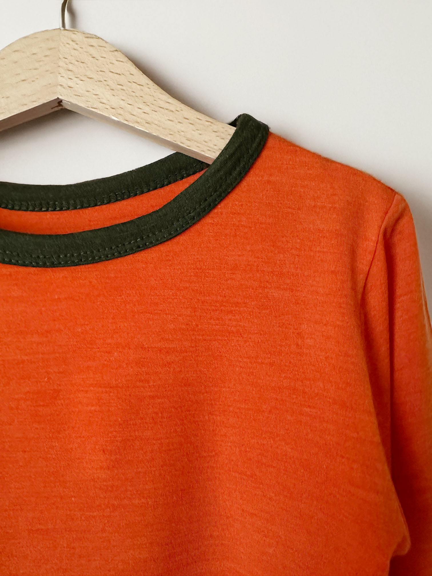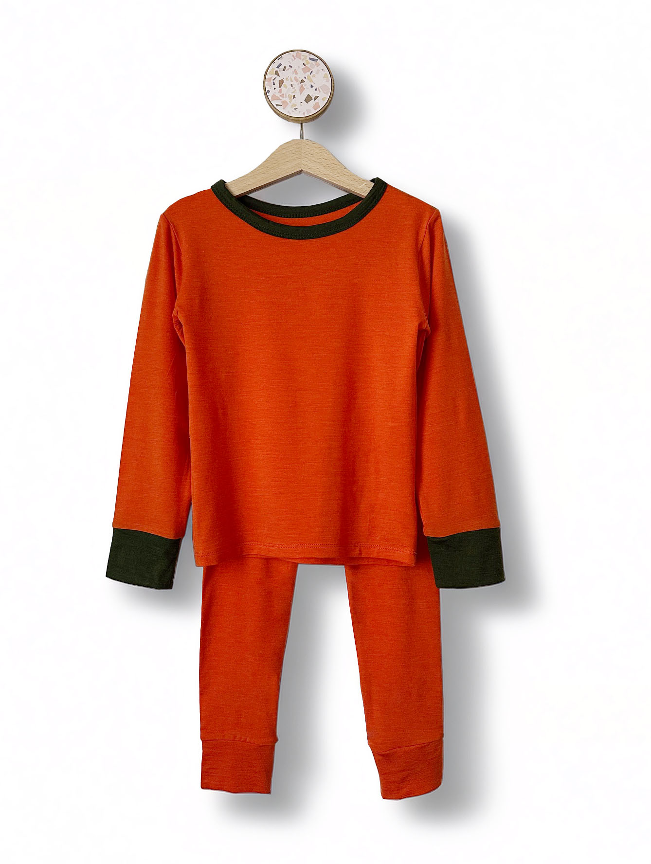 Setul de bluză și colanți din lână merinos și mătase pentru copii – Orange/ Dark Green oferă un confort natural excepțional, potrivit pentru toate anotimpurile. Realizat dintr-un material subțire, fin și ușor (170 g/mp), setul este ideal ca strat de bază (base layer) sau purtat ca ținută de zi cu zi.