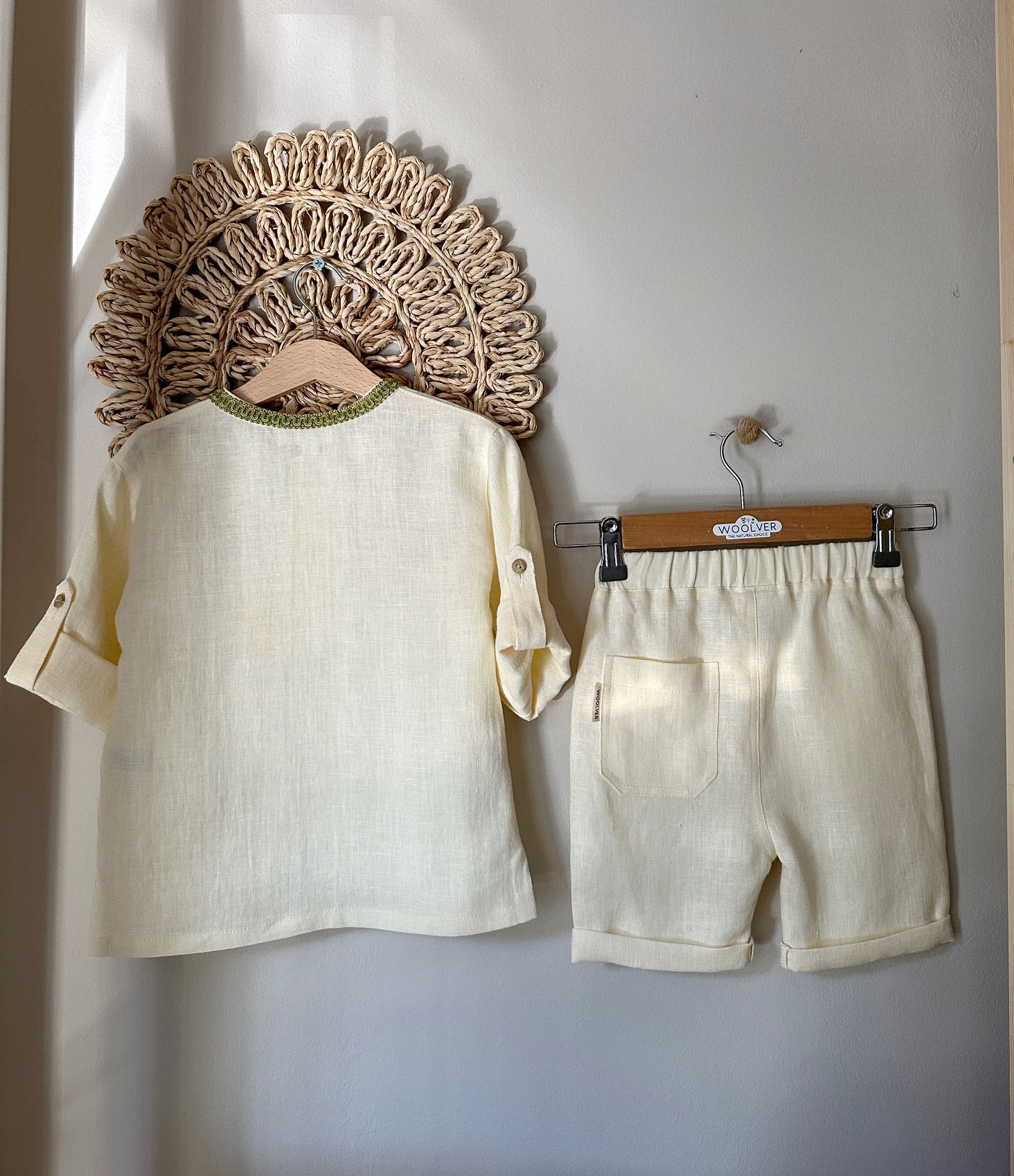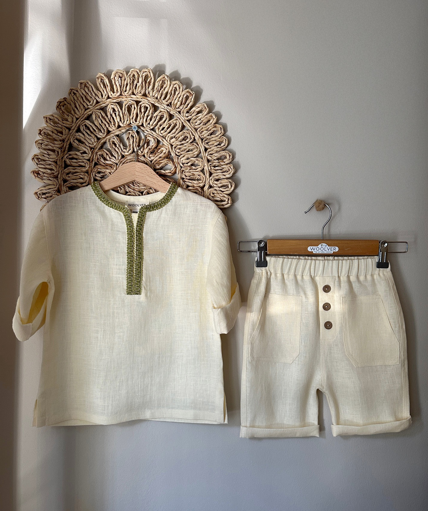 Set bluza si pantaloni scurti din in organic cu model traditional – Cream