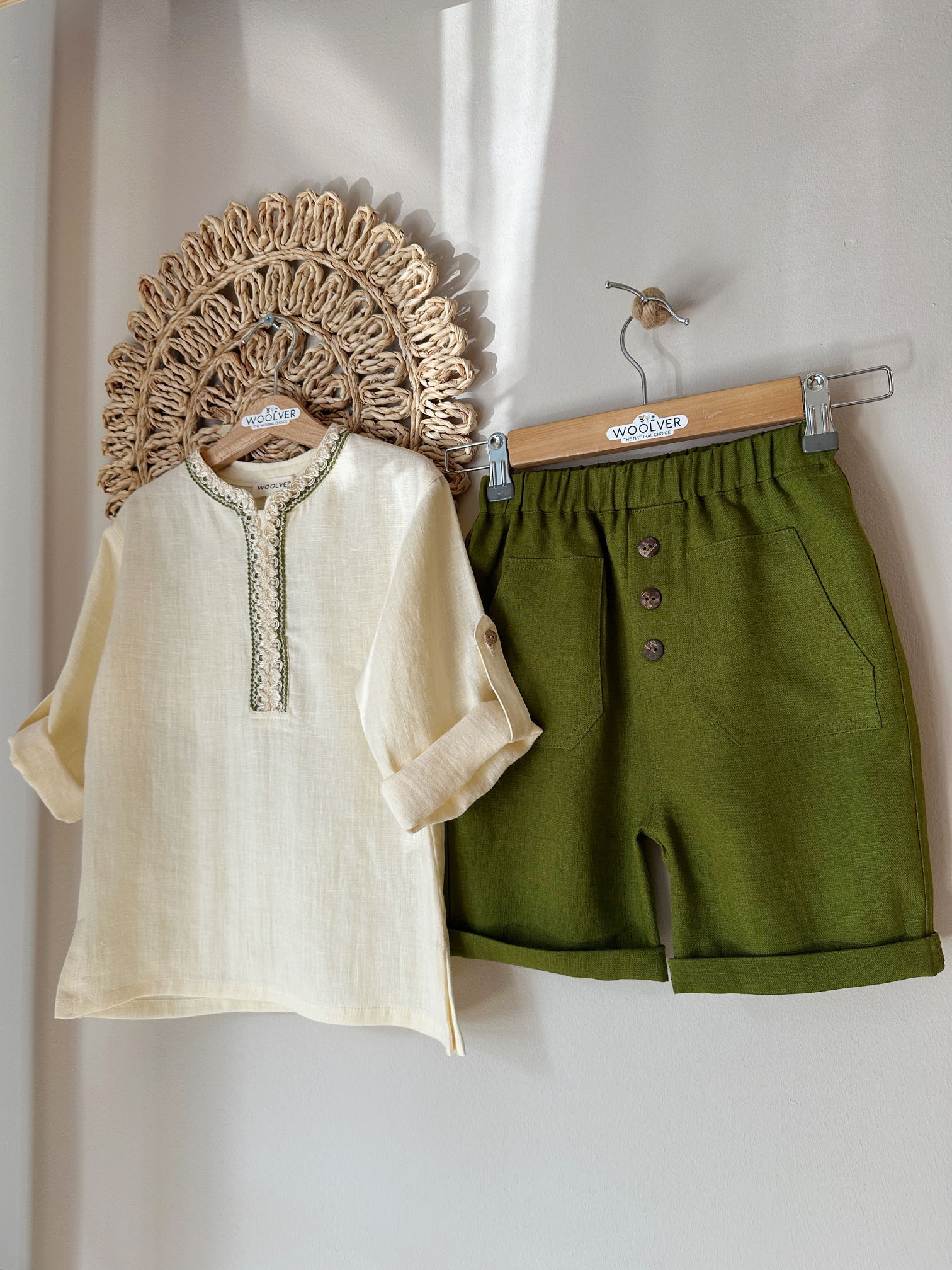 Set bluza si pantaloni scurti din in organic cu model traditional – Cream/Moss Green