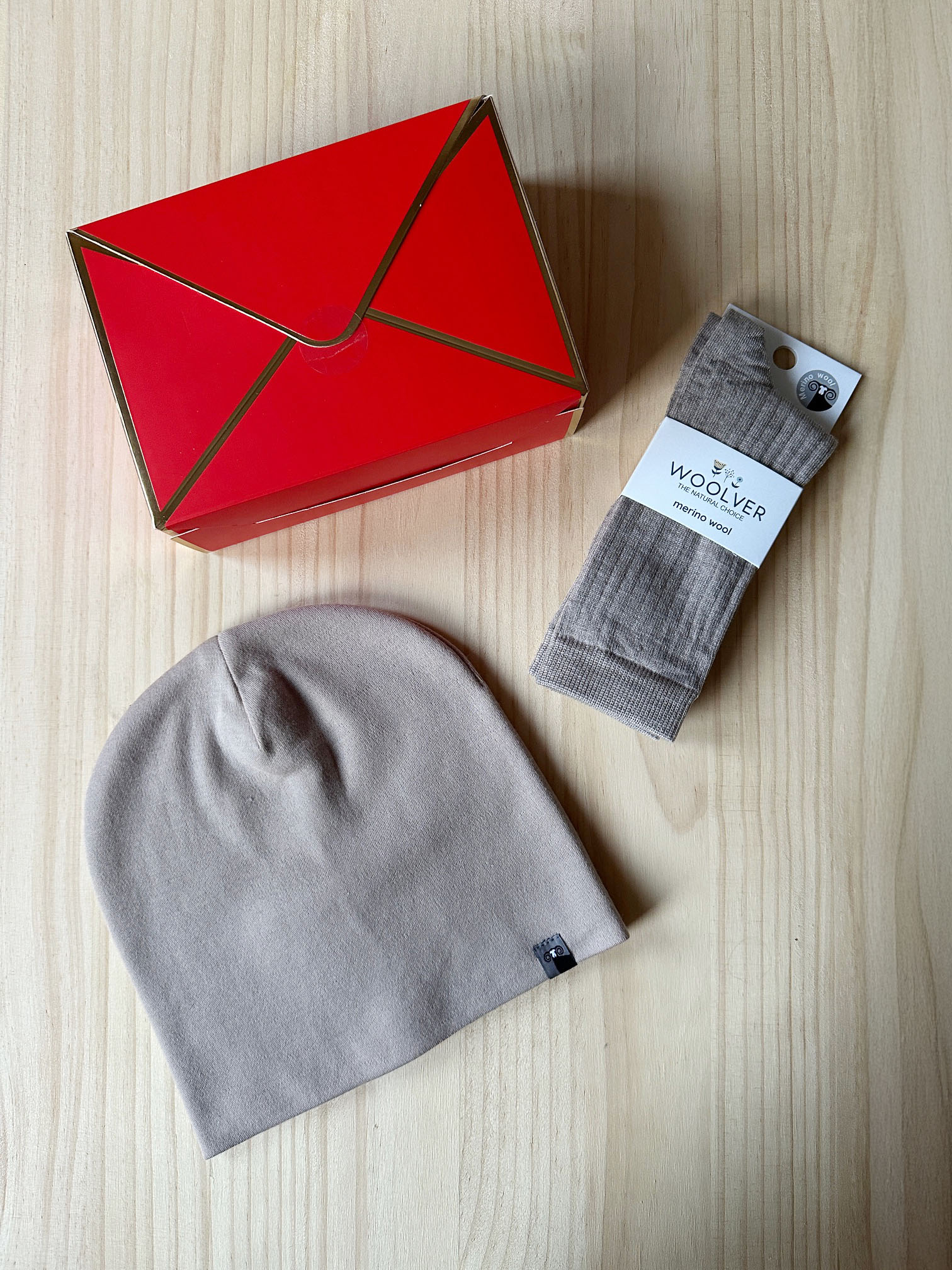 Set cadou Beige din lână merinos extrafin – Căciulă și Șosete