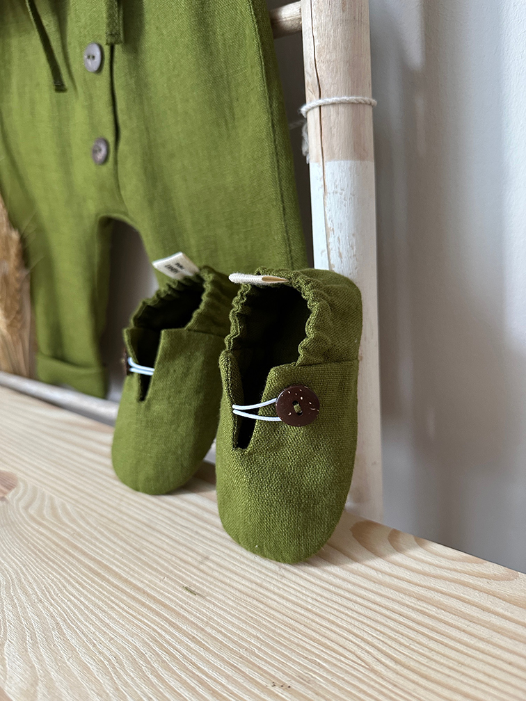 Set costumas de botez cu guler si botosei din in organic – Moss Green Leaf