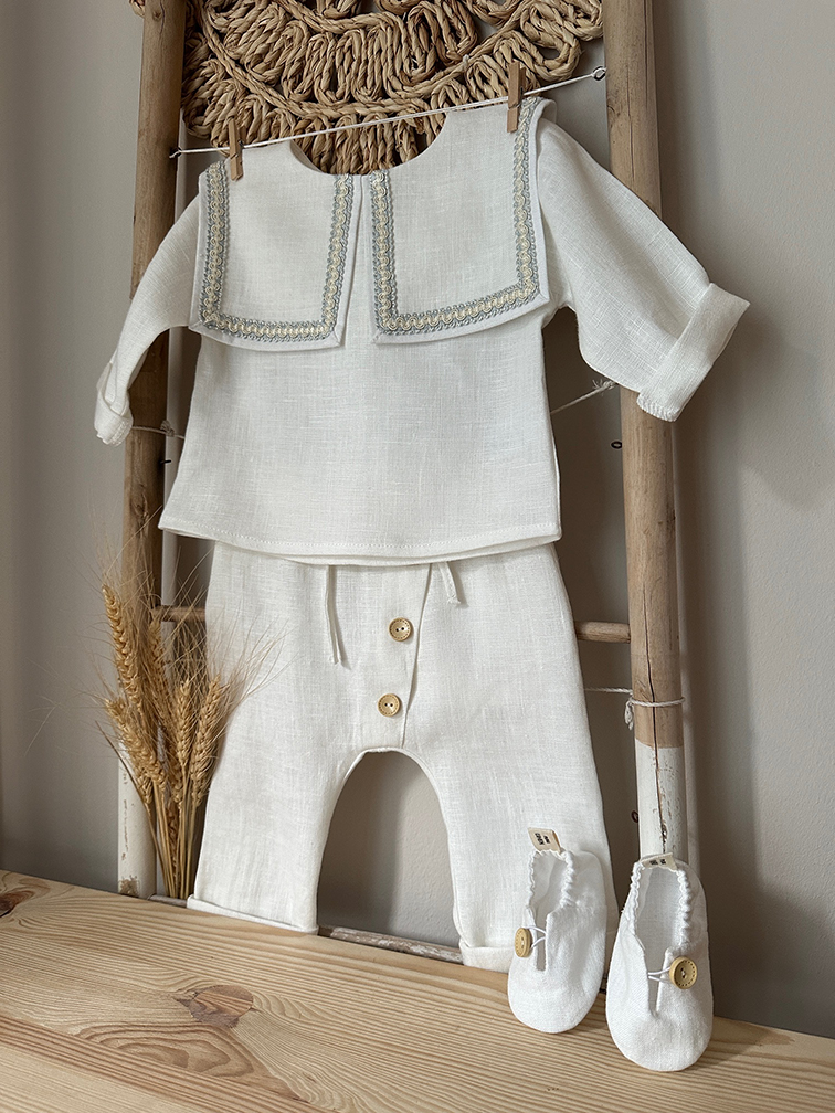 Set de botez din in organic. Ideal pentru ziua cea mare a micutului tau, dar comfortabil, usor de asortat si practic si cu alte ocazii.