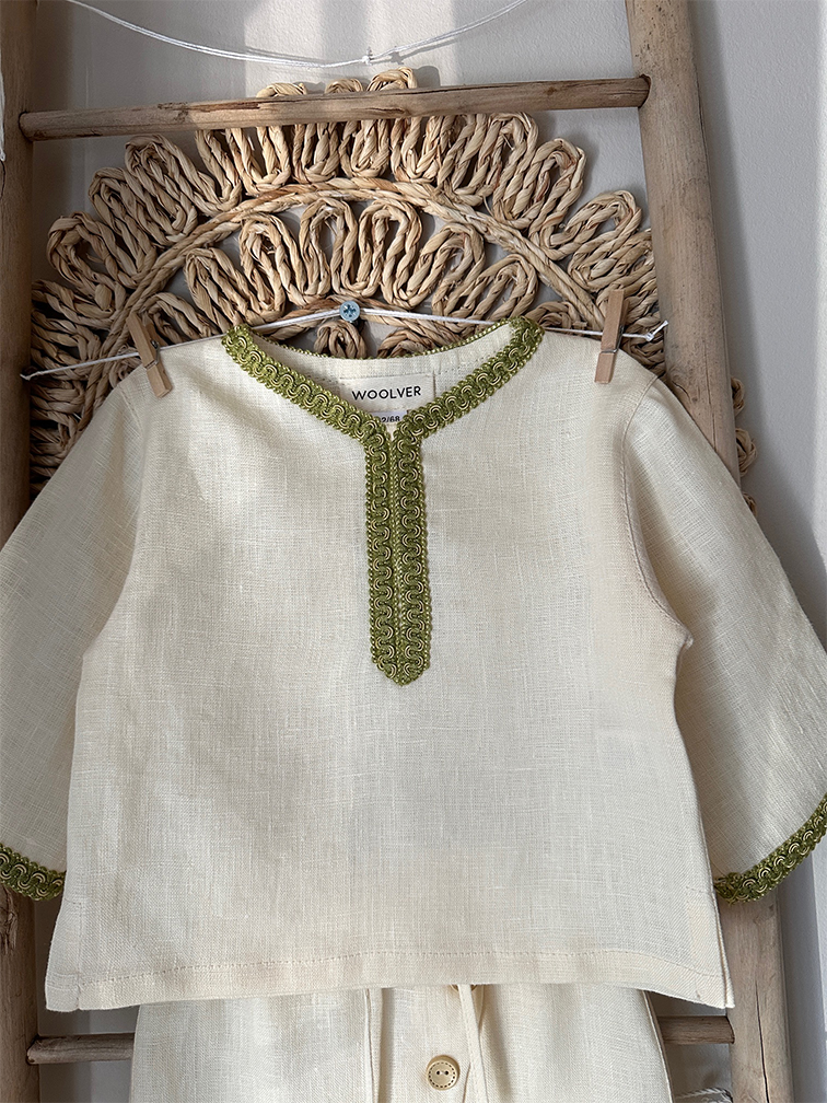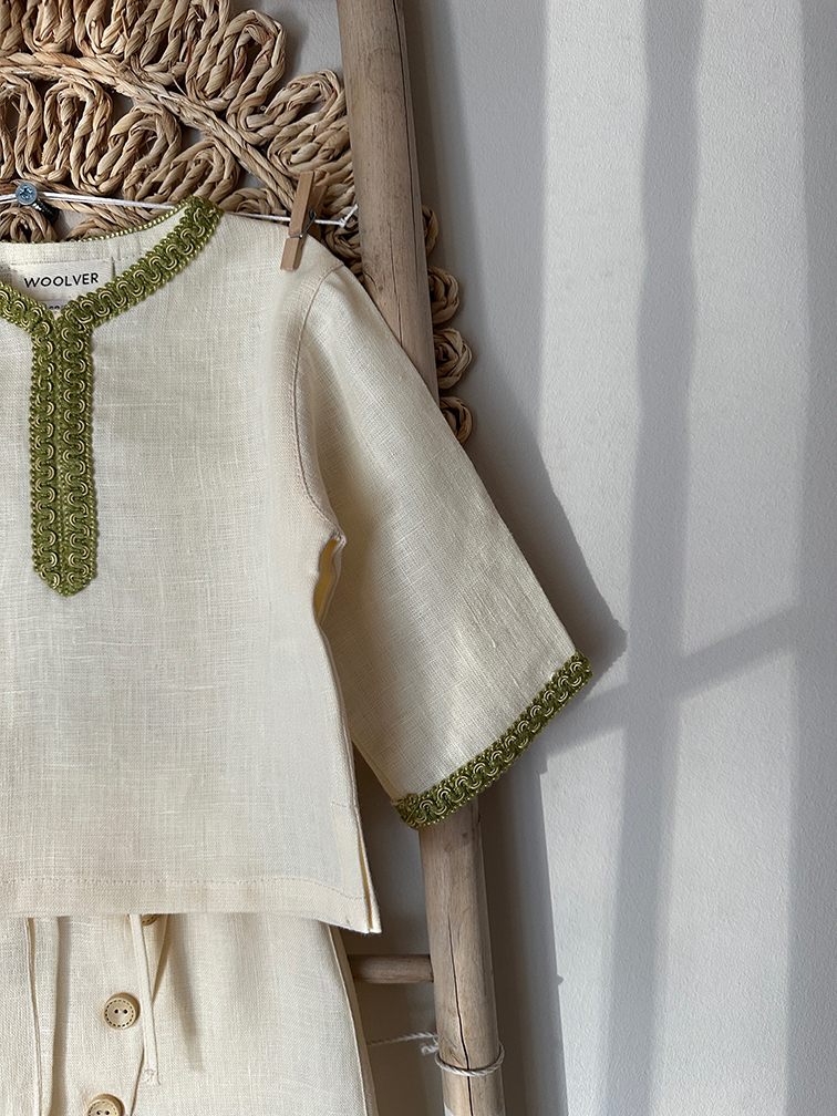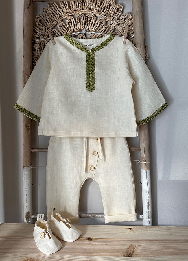 Set costumas de botez si botosei din in organic Cream/ Moss Green