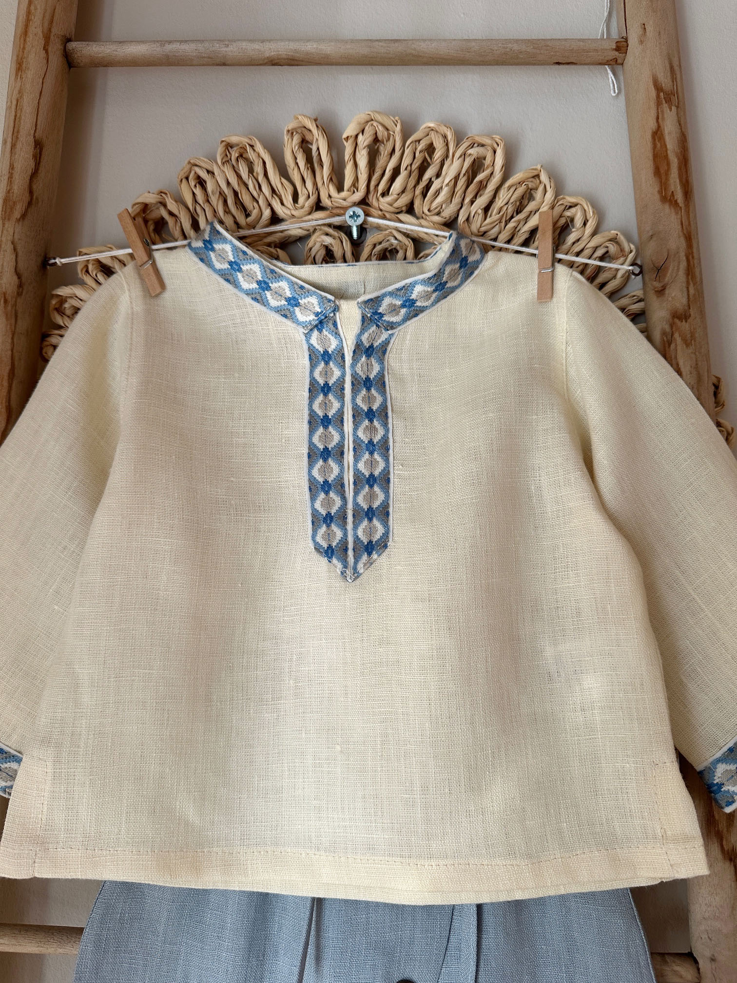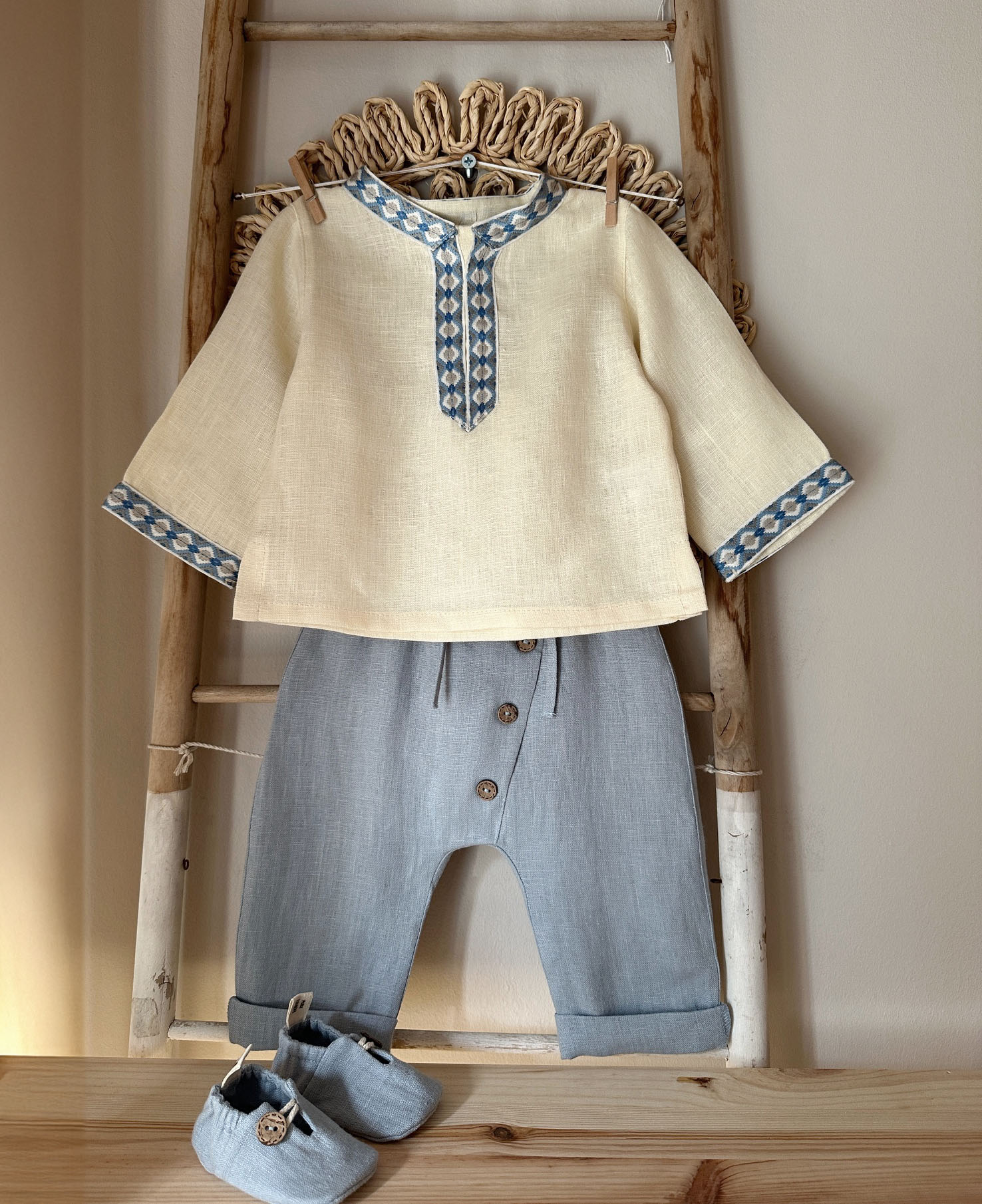 Set costumas de botez si botosei din in organic cu model traditional Cream/ Blue Grey Sky